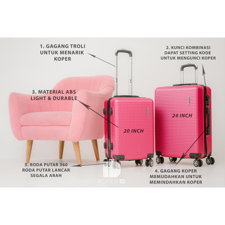 Produk ini didesain sebagai solusi praktis untuk perjalanan jarak dekat hingga menengah, dengan fokus pada kemudahan transportasi. Fitur utamanya adalah sistem 4 roda putar 360 derajat yang memungkinkan manuver halus dan ringan, serta kunci kombinasi untuk keamanan barang bawaan. Desain hardcase dengan kompartemen luas memastikan barang tersusun rapi, sementara pegangan yang bisa naik turun memudahkan penanganan saat memuat atau memindahkan koper. Packing aman dengan double bubble wrap juga menjadi nilai tambah yang konsisten mendapatkan pujian dari pembeli, menjamin barang sampai dalam kondisi prima.