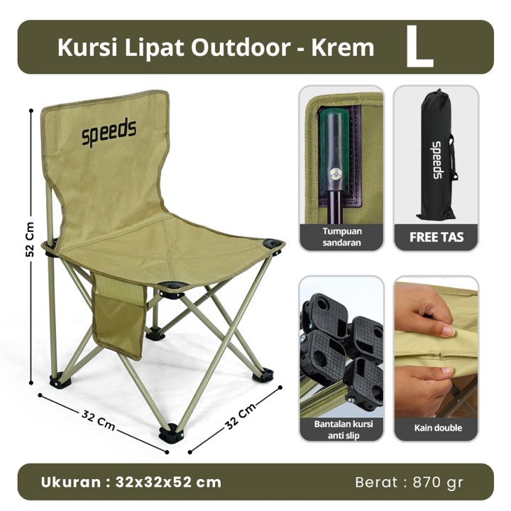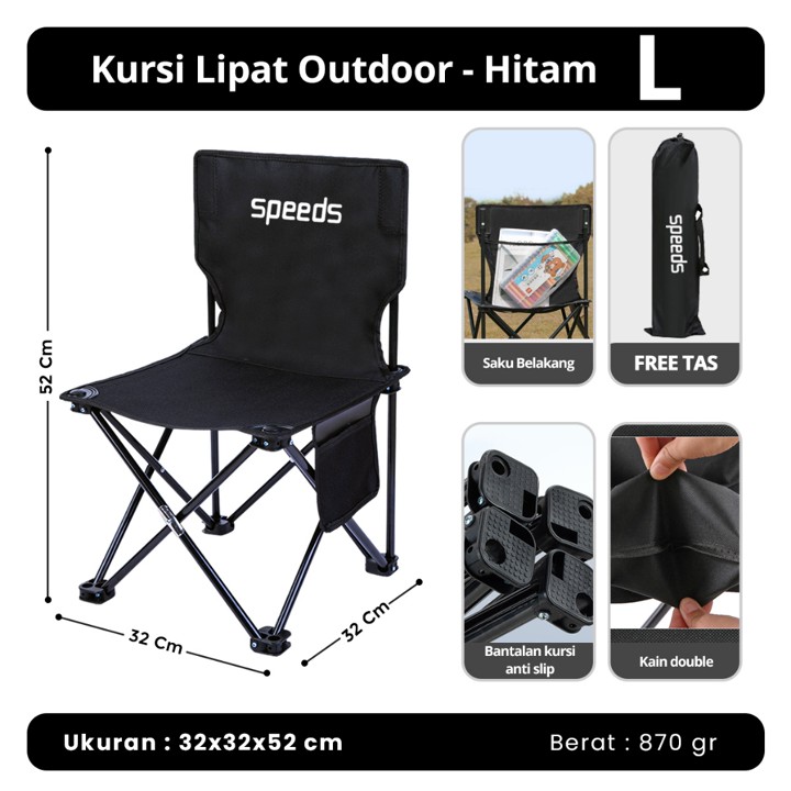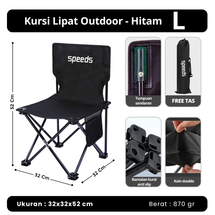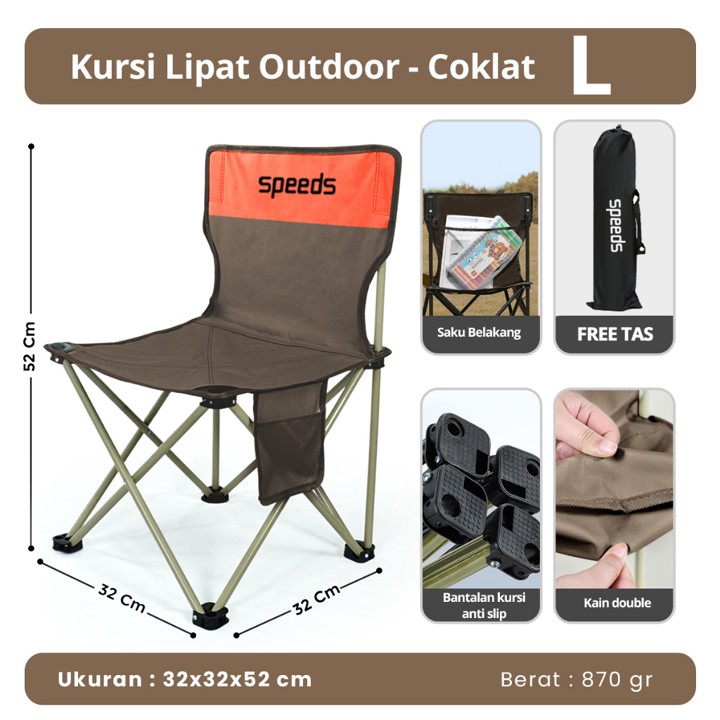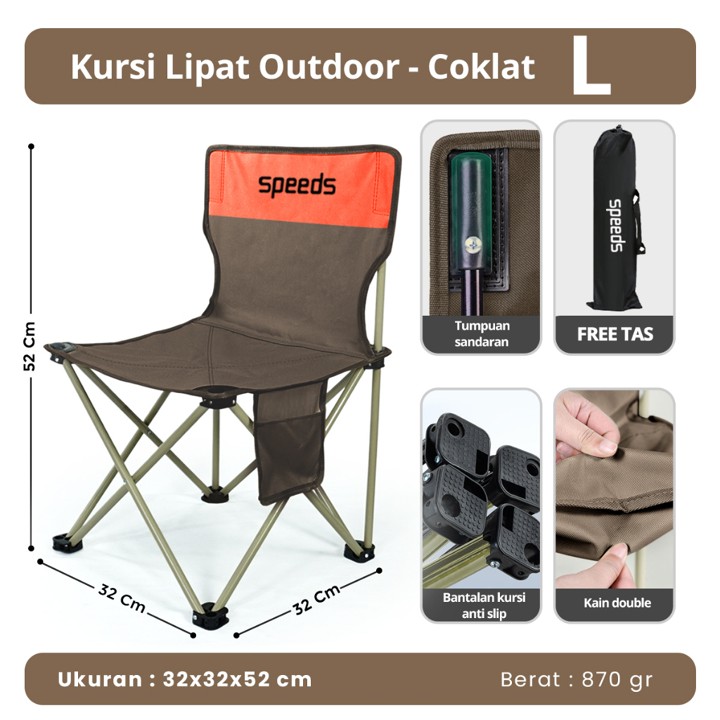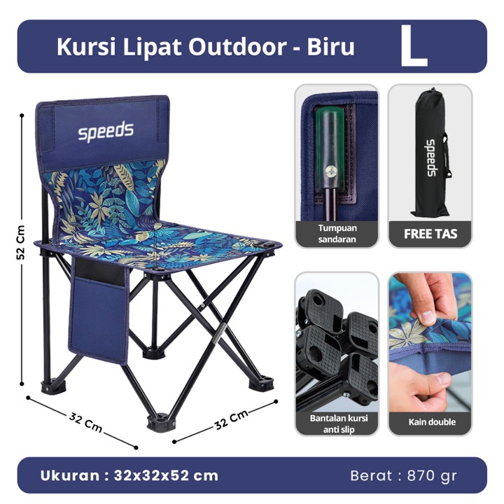 SPEEDS LX 031-14 adalah kursi lipat outdoor portabel dengan desain kokoh dan ringan, ideal untuk kegiatan camping, mancing, atau piknik. Dengan harga di bawah Rp 52.000, produk ini menawarkan nilai luar biasa dengan bahan Oxford tahan air dan rangka besi pipa yang mampu menopang beban hingga 95 kg.