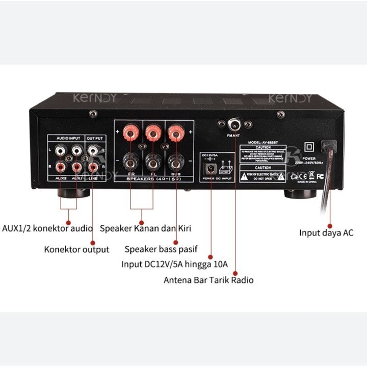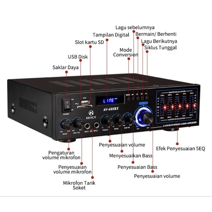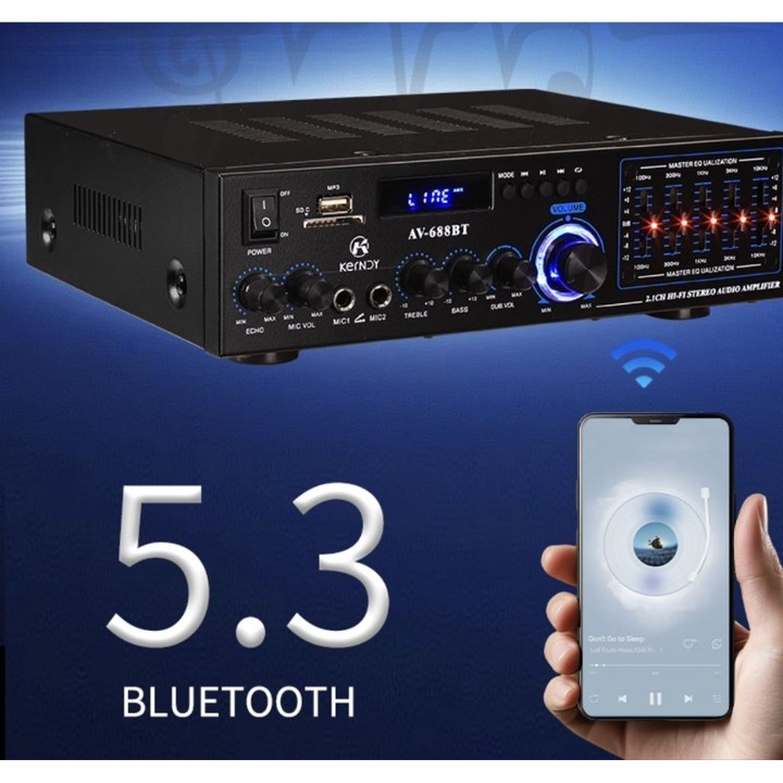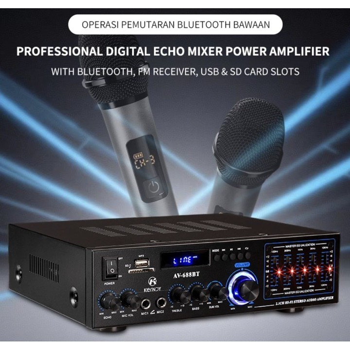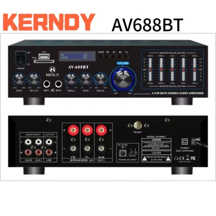 Amplifier Kerndy AV-688BT adalah solusi audio 2.1 channel dengan Bluetooth 5.3 yang menawarkan suara jernih dan bass kuat untuk kebutuhan karaoke rumahan atau home theater. Dengan fitur EQ yang dapat disesuaikan dan empat input mikrofon, produk ini memberikan pengalaman audio yang fleksibel dan bertenaga.
