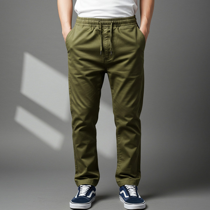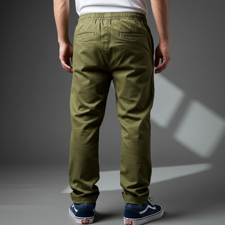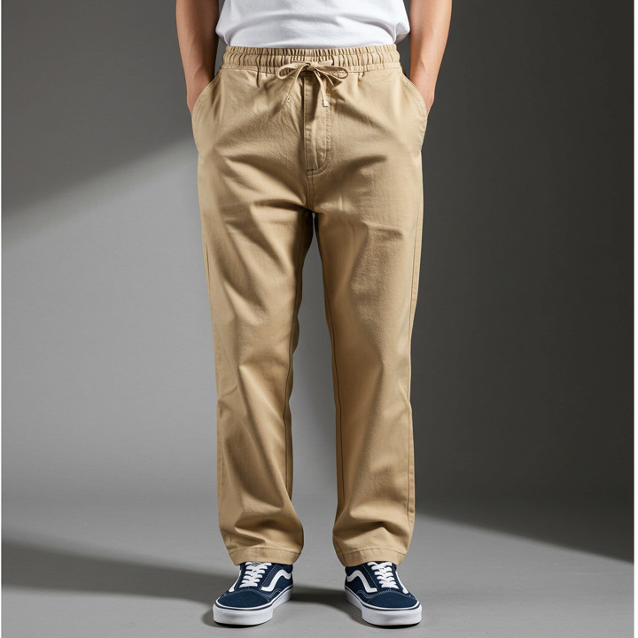 Produk ini dibuat dari bahan cotton twill yang memiliki sifat stretched atau elastis, memberikan kenyamanan tinggi saat dipakai karena bahannya yang adem dan tidak kaku. Konstruksi celana dilengkapi dengan pinggang full karet yang aman dan fleksibel, serta jahitan yang dinilai kuat oleh mayoritas pembeli berdasarkan ulasan positif yang menyebutkan kualitas bahan yang tebal namun tetap nyaman.