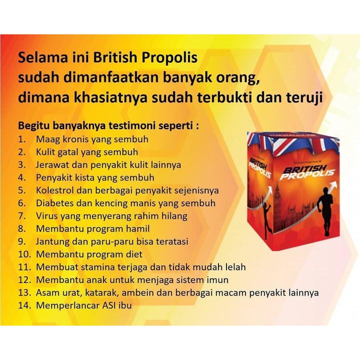 Produk ini menonjolkan kualitas premium dengan standar formulasi Inggris dan kandungan flavonoid 4-14 kali lebih tinggi dari propolis biasa, serta telah mendapatkan izin edar resmi BPOM (POMTR 183610771) yang menjamin keamanan dan keasliannya. British Propolis diklaim mampu memberikan efek positif dalam waktu kurang dari 21 hari, cocok untuk Anda yang mencari solusi cepat bagi masalah kesehatan kronis maupun peningkatan daya tahan tubuh.