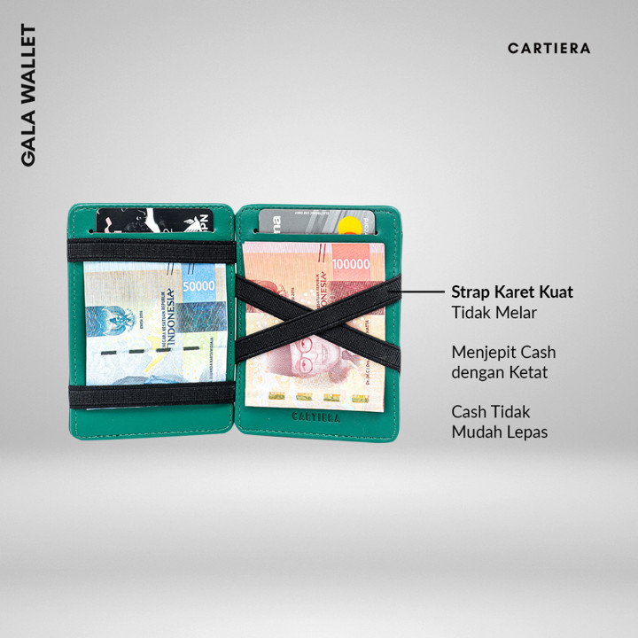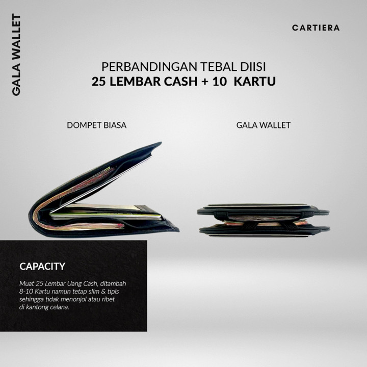 Cartiera Gala Wallet adalah dompet kartu slim premium dengan kapasitas penyimpanan uang cash yang mengejutkan hingga 25 lembar dan 8 slot kartu. Dibuat dari vegan leather berkualitas dengan konstruksi rapi, dompet ini menawarkan solusi praktis bagi pengguna yang mengutamakan kesederhanaan tanpa mengorbankan fungsionalitas.