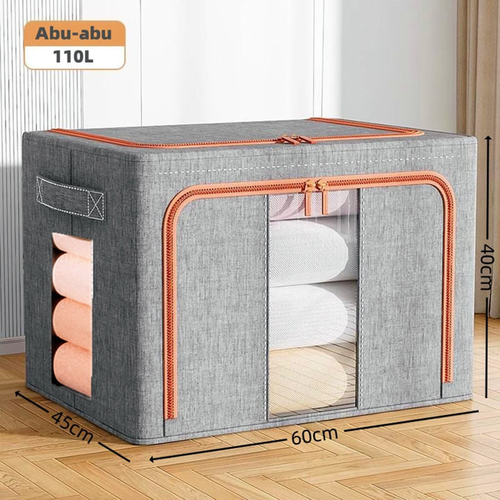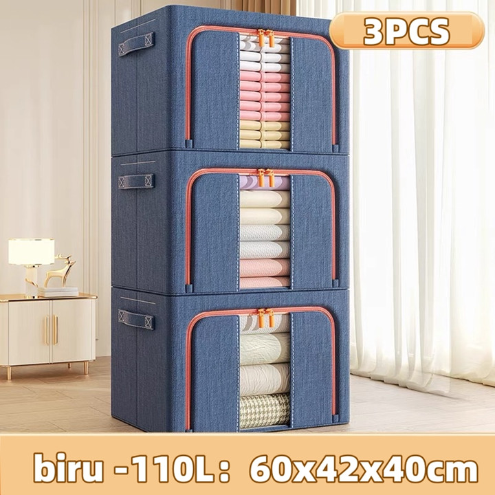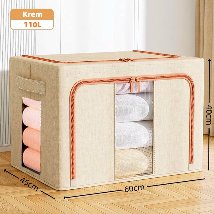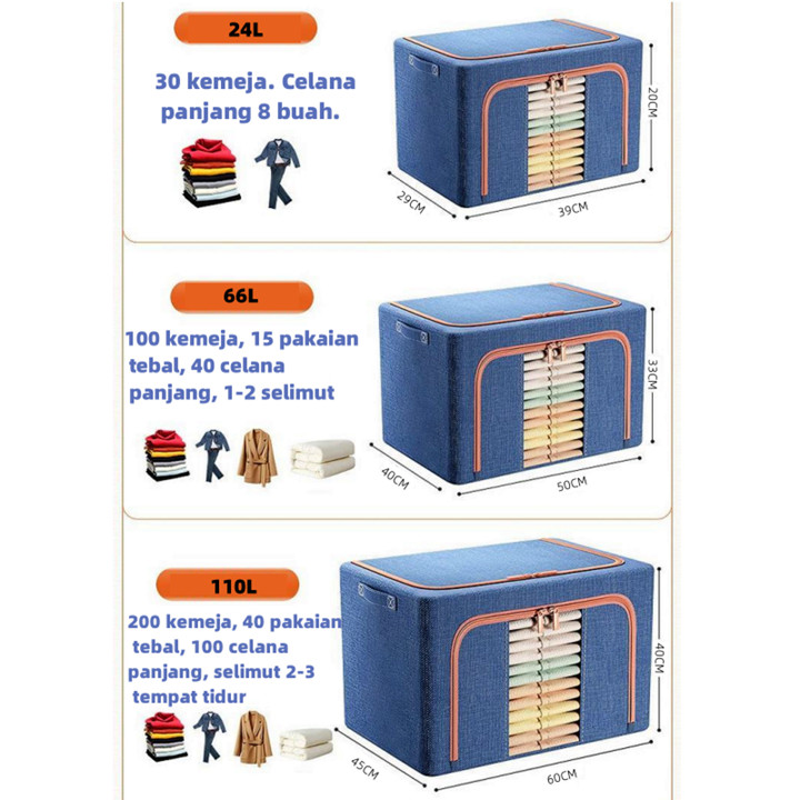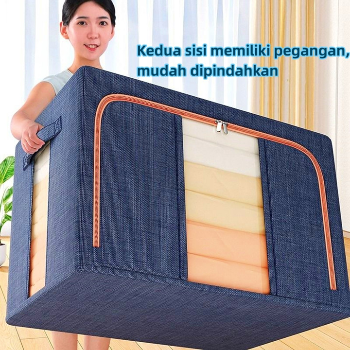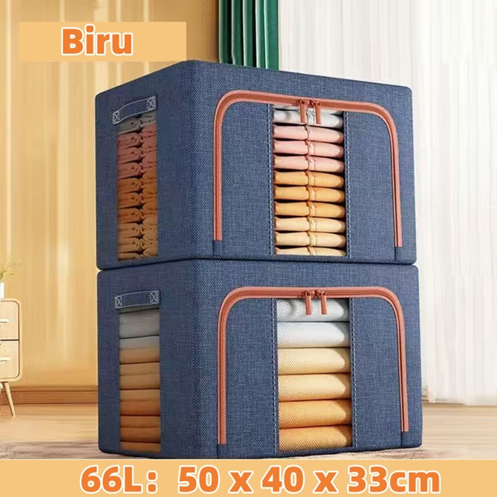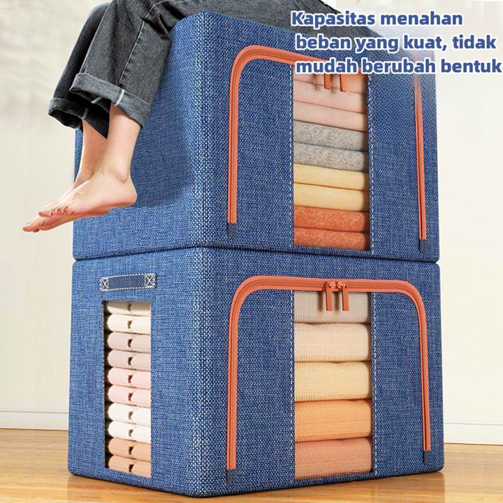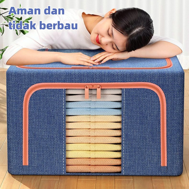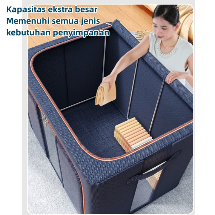 Produk ini dikonstruksi menggunakan kombinasi bahan kain berkualitas tinggi untuk lapisan luar yang tahan debu dan anti serangga, didukung oleh rangka baja yang kokoh dan dapat ditumpuk. Konstruksinya dirancang dengan pengait besi di sisi-sisinya yang memungkinkan kotak berdiri tegak dan saling bertumpuk tanpa roboh, sementara mekanisme lipatan pada bagian kain memudahkan proses pembukaan dan penutupan untuk menghemat ruang saat tidak digunakan. Kekuatan struktur baja menjamin daya tahan beban hingga 50 kg, menjadikannya solusi penyimpanan yang stabil dan awet untuk jangka panjang.