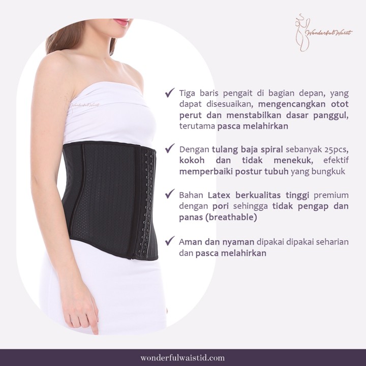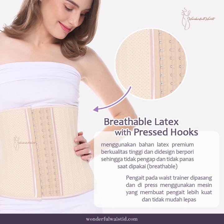 Material utama yang digunakan adalah latex dengan fitur lubang sirkulasi udara (breathable) yang memungkinkan pertukaran udara lancar, mengurangi rasa panas dan lembap pada area perut. Desain ini memastikan bahwa tekanan yang diberikan efektif untuk membentuk siluet tanpa membatasi ruang gerak pengguna secara signifikan.