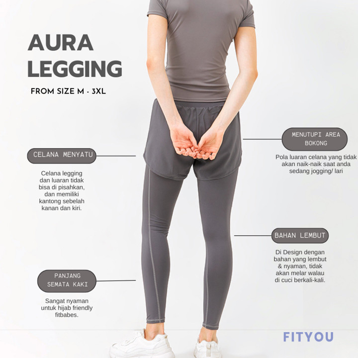 Aura Legging adalah bawahan olahraga 2-in-1 multifungsi yang dirancang khusus untuk kenyamanan maksimal, terutama bagi pengguna hijab. Kombinasi legging dan inner celana lari membuatnya sangat praktis untuk berbagai aktivitas fisik, menawarkan tampilan yang lebih tertutup dan percaya diri saat berolahraga.