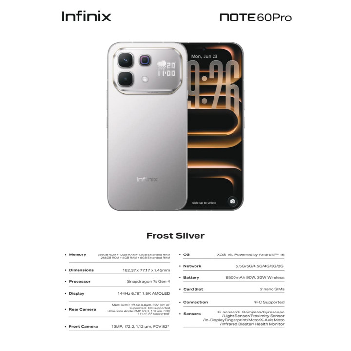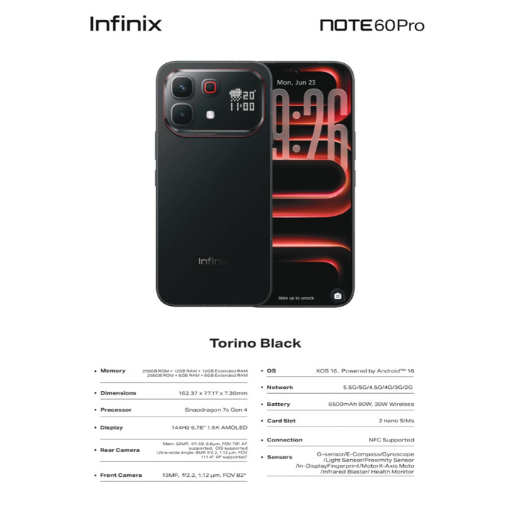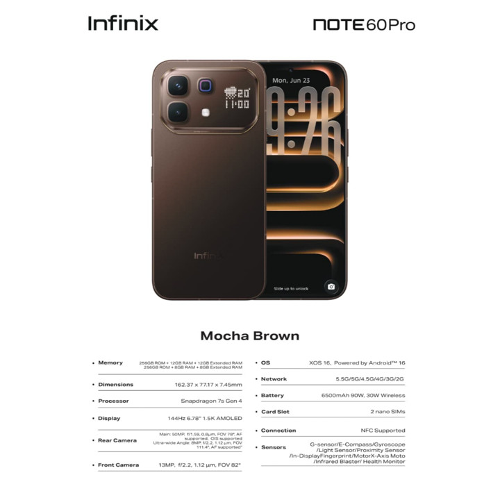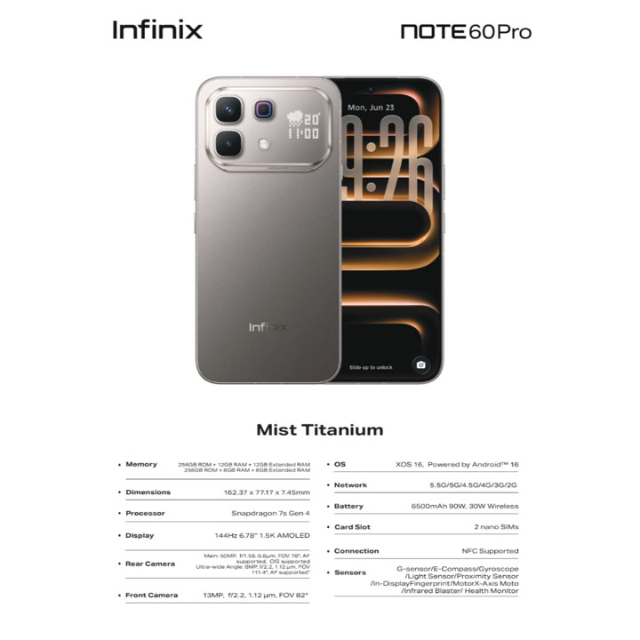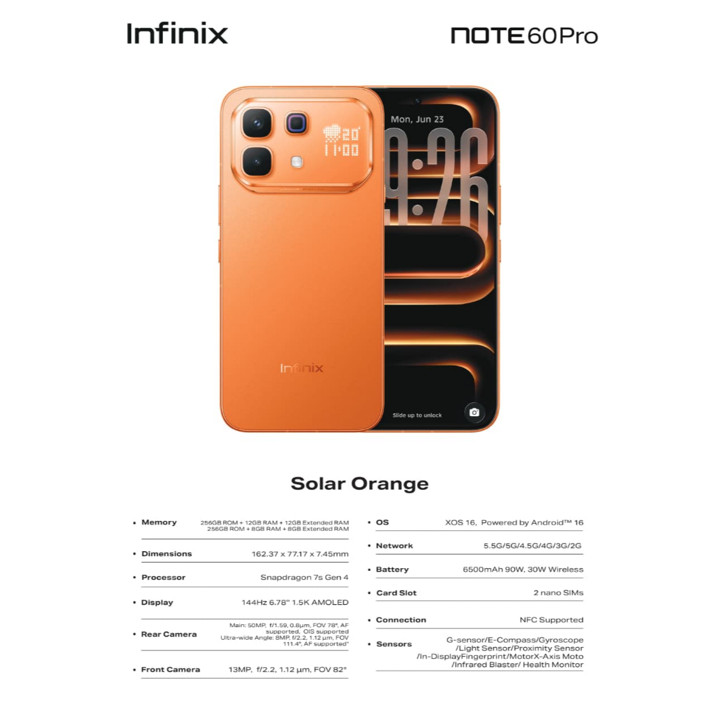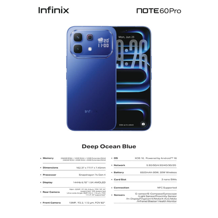 Infinix Note 60 Pro 5G menawarkan performa tangguh dengan prosesor Snapdragon 7s Gen 4 dan baterai raksasa 6500mAh yang didukung pengisian daya cepat 90W. Dilengkapi layar AMOLED 6.78 inci FHD+ dan kamera utama 50MP, smartphone ini menjadi pilihan ideal bagi pengguna yang mengutamakan daya tahan baterai dan kecepatan jaringan 5G.