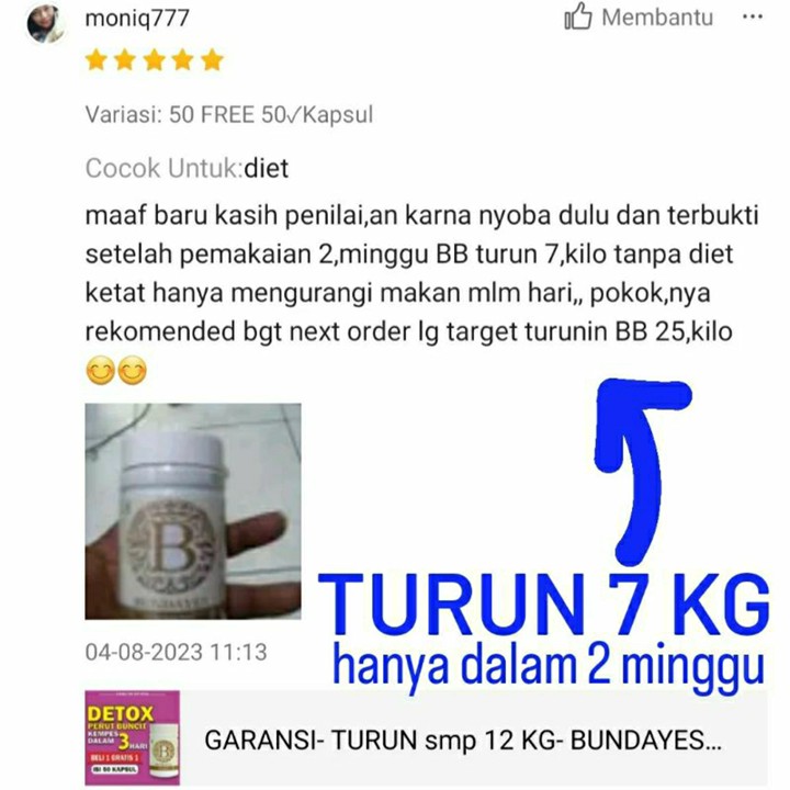 Ini orderan ke 3, alhamdulillah udah turun BB 10kg, yg awalnya 78 sekarang jadi 68.. masih terus berproses sampai BB 55..nyesel gak kenal product ini dari dulu. Terimakasih untuk free product nya juga ya..semoga bermanfaat, dan tokonya makin laris..