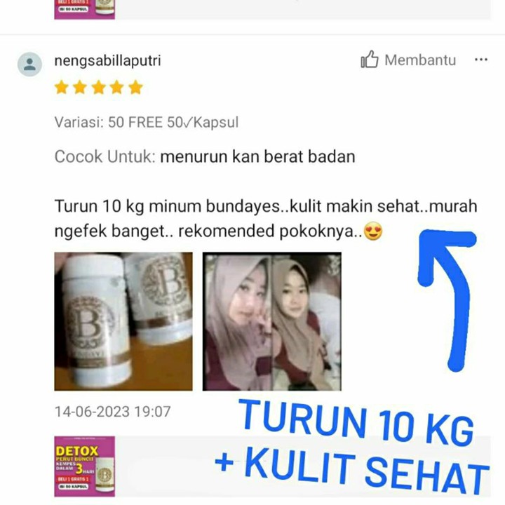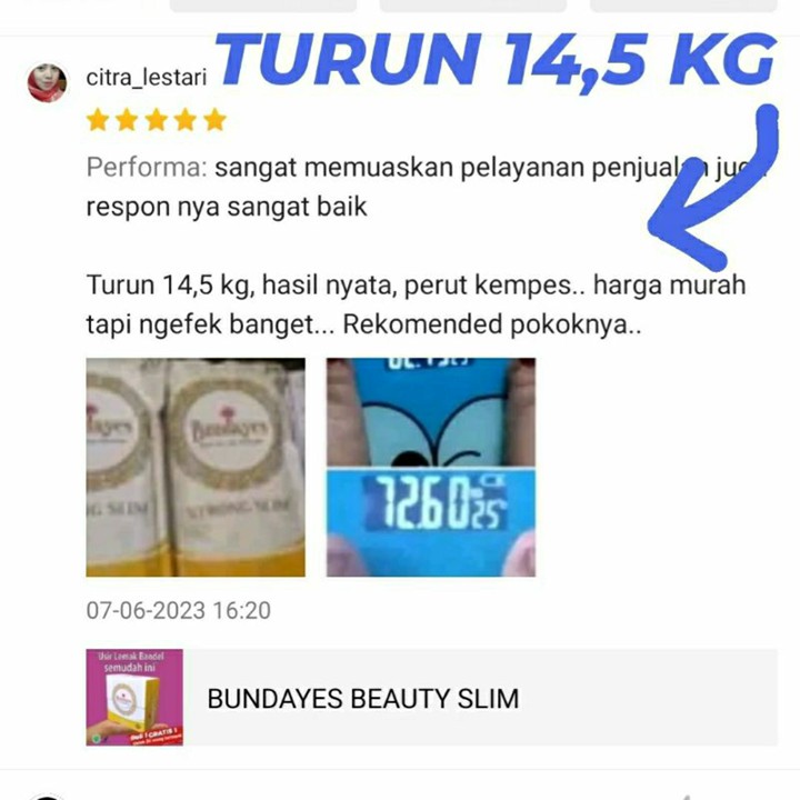 Udah turun bb ku Bagian lengan sm perut atas yg kelihatan udah smakin mengecil ...di kulit semakin bersih,,padahal aq jarang luluran,,tp mmg ngefek banget di kulit.. Makasih bundayes β€οΈβ€οΈ