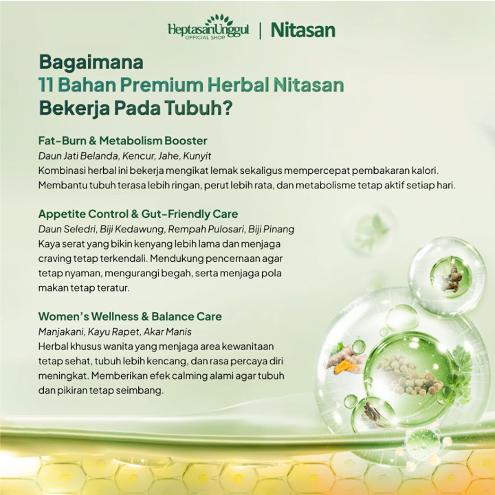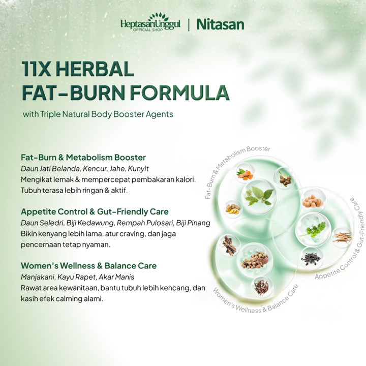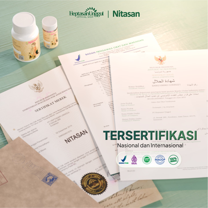 Produk ini menggunakan bahan dasar herbal murni yang diekstrak secara alami, menjamin keamanan konsumsi jangka panjang. Dengan komposisi herbal yang mengandung antioksidan dan antimikroba, Nitasan tidak hanya fokus pada penurunan berat badan, tetapi juga memberikan manfaat kesehatan tambahan seperti mengatasi masalah bau tidak sedap pada wanita dan memperkuat sistem kekebalan tubuh. Sertifikasi BPOM TR 083 391 921 dan label Halal memastikan bahwa produk ini memenuhi standar keamanan dan kualitas yang ketat di Indonesia.