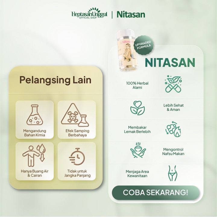 Nitasan Pelangsing adalah suplemen herbal alami yang telah teruji sejak tahun 2000-an dengan sertifikasi BPOM dan Halal, menawarkan solusi penurun berat badan melalui pengontrol nafsu makan, penghambat penyerapan lemak, dan peningkatan metabolisme tanpa efek samping seperti lemas atau diare.
