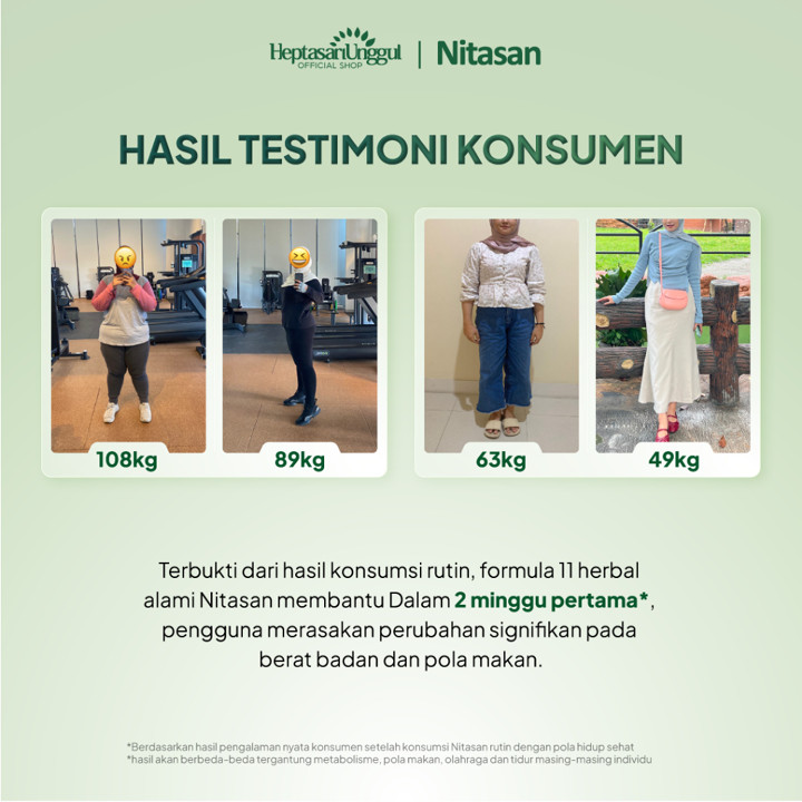 Awalnya agak skeptis mau coba Nitasan, tapi setelah rutin minum selama sebulan, hasilnya ok bgt siiih!!! BB turun 5kg tanpa harus diet yang ribet. Nitasan bantu banget kontrol craving, jadi ngemil-ngemil gak ada lagi deh. Stamina juga tetep on fire seharian, gak ada drama lemes-lemesan! Buat yang masih galau, langsung coba aja, asal konsisten pasti berasa hasilnya! Thank you Nitasan, bikin makin pede! π