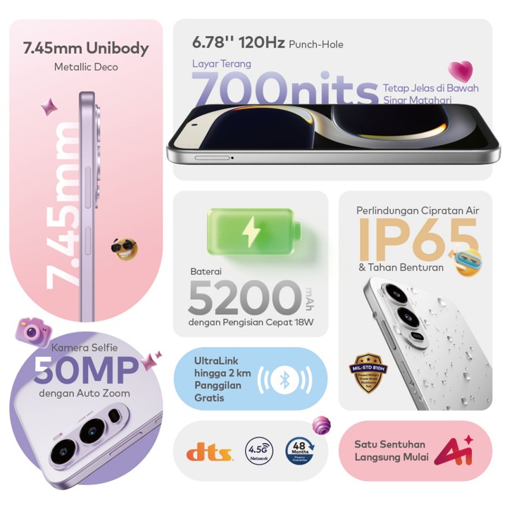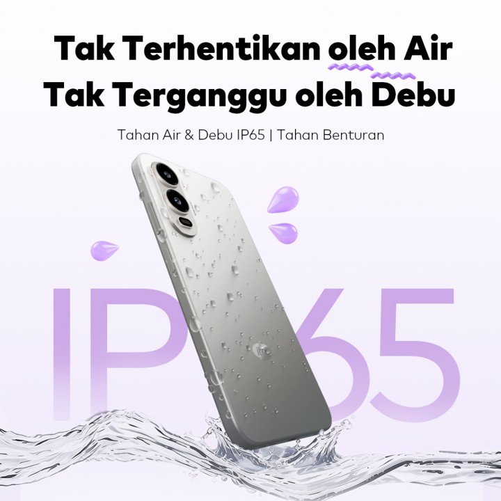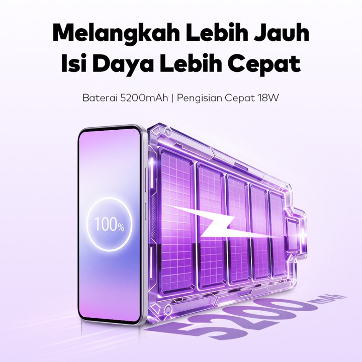 Konstruksi smartphone ini mengusung desain unibody metal setipis 7.45mm yang memberikan kesan premium dan ringan, serta memiliki sertifikasi ketahanan air dan debu IP65 yang jarang ditemukan di segmen harga ini. Meskipun deskripsi menyebutkan IP65, beberapa atribut teknis juga mencantumkan IP64, namun secara umum material bodi metal memberikan ketahanan fisik yang lebih baik dibandingkan plastik biasa. Baterai berkapasitas besar 5200mAh didukung pengisian daya 18W memastikan pengguna dapat beraktivitas seharian penuh tanpa khawatir kehabisan daya, sangat cocok untuk mobilitas tinggi.
