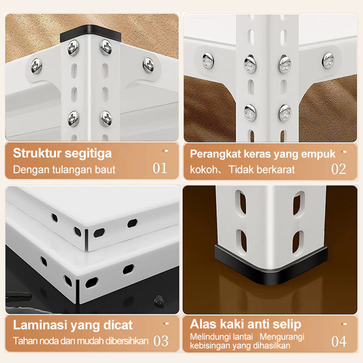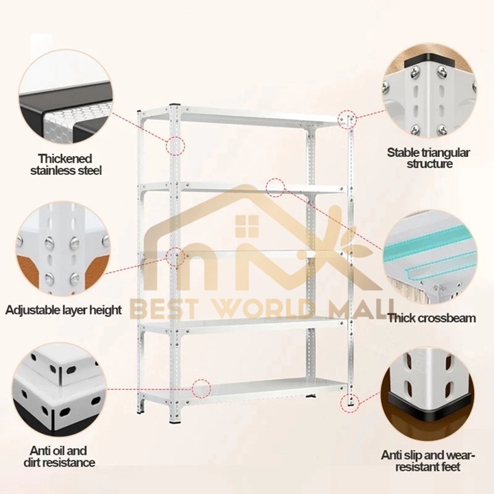 Secara fitur, produk ini menonjolkan fleksibilitas dimensi yang sangat detail, mulai dari 3 hingga 6 lapisan, memungkinkan penyesuaian rak untuk berbagai skenario seperti rak toko, rak gudang, atau rak sepatu. Keunggulan utamanya adalah spesifikasi beban yang sangat tinggi (1100kg) dan fitur anti-karat (Rust Resistant/Proof), menjadikannya pilihan yang tangguh untuk penyimpanan berat.